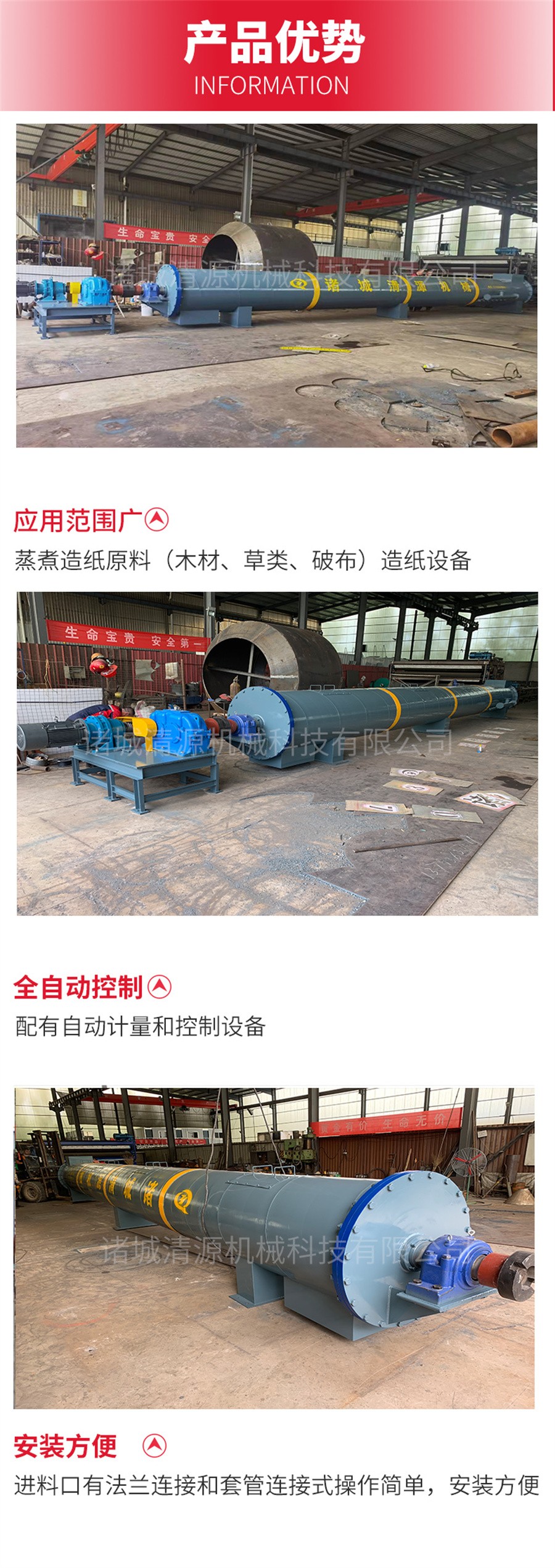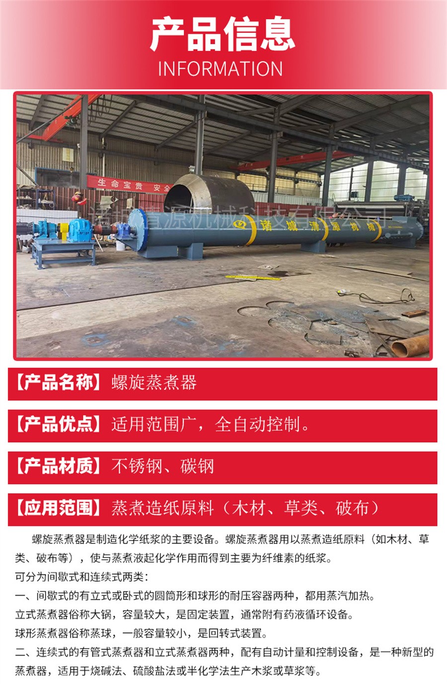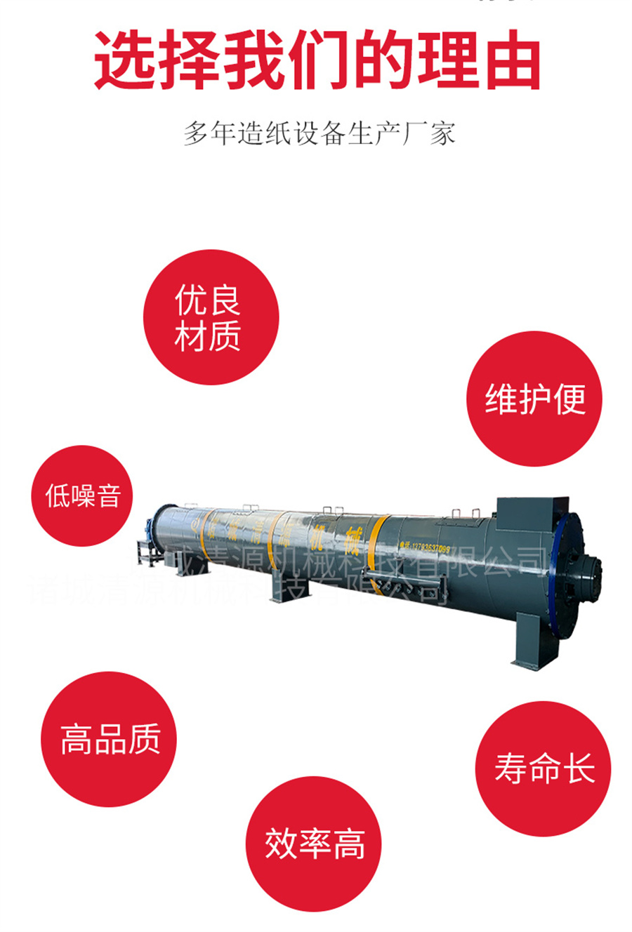 諸城清源機(jī)械科技有限公司生產(chǎn)的螺旋蒸煮器用以蒸煮造紙?jiān)希ㄈ缒静?、草類、破布等),使與蒸煮液起化學(xué)作用而得到主要為纖維素的紙漿。